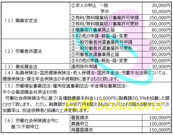 (2)手続報酬の欄に記載されていない労働社会保険諸法令に関する事務を行う場合は、依頼者と協議の上決定致します。